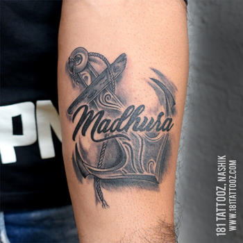 Anchor tattoo usually means stability, peace, strength, determination and passion. This realistic anchor with name Madhura, shows the commitment towards the person.