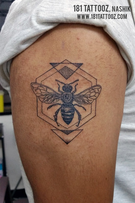 Honey bee tattoo symbolizes hard-work and co-operation. A client got this realistic honeybee tattoo with a honey comb pattern.