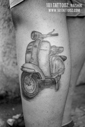 A photo-realistic tattoo of vintage Lambretta scooter on calf. This tattoo resembles the passion for vintage and a long-lasting memory of the family vehicle.