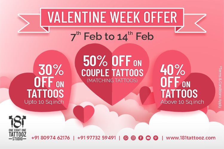 Celebrate the days of valentine by getting inked at 181 Tattooz Studio as we are offering Huge Discounts of up to 50% Off on Permanent Tattoos. Yes, as every year we are here with the valentine's offer, this offer is very special and beneficial because this time we haven’t kept any tattoo style or category away from the offer and there are huge discounts on Permanent Tattoos. So those who were waiting for offers to get inked this is the best time for you.