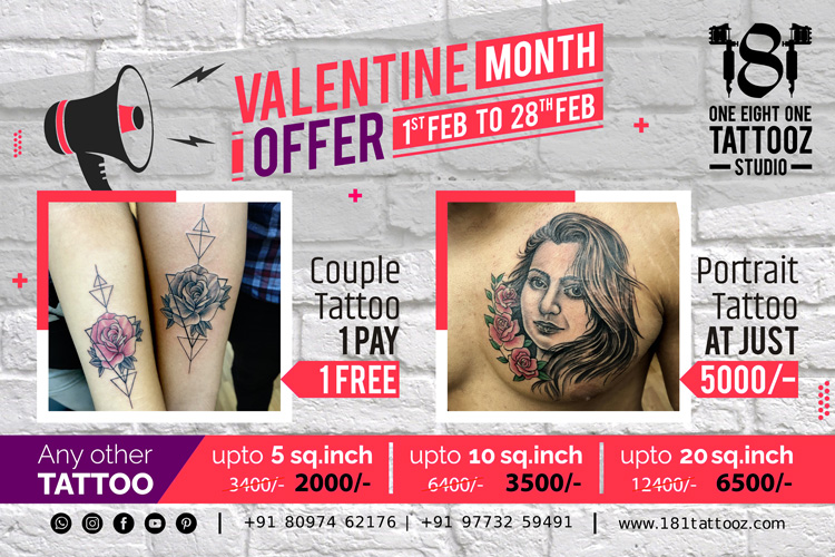 The Month of LOVE is here with an amazing and most awaited offer of the year. It the month of Valentine…and we are here with huge offer for all tattoo enthusiasts, which is not limited for couples, anyone can get inked at discounted price. Hurry up and Get your Appointments fixed as soon as possible at 181 Tattooz Studio..!!